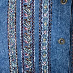 Authentic vintage Koret denim button-down shirt featuring intricate embroidered vertical panels at the front. Classic medium-wash 100% cotton denim with a pointed collar and long sleeves. Beautiful 90s cottagecore and artsy teacher vibe with subtle Southwestern-inspired detailing. Structured yet soft cotton with timeless wearability. Perfect layered open or worn buttoned as a statement top.