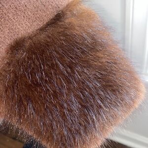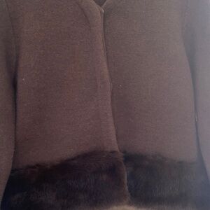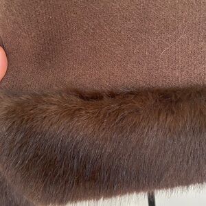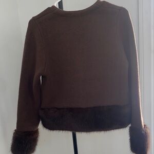 Elegant brown sweater. Features luxurious fur trim on cuffs and hem. Perfect for a chic look.