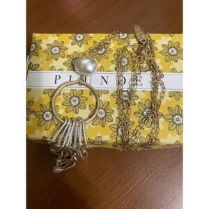 Mixed metal long necklace features a unique combination of gold and silver-tone paperclip chain links suspended from a textured gold-tone ring. A luminous white faux pearl sits at the top of the pendant, while smaller pearl accents dangle from the ends of the mixed metal fringe for a modern, boho-inspired look. The delicate gold-tone chain is finished with a lobster claw clasp and a signature Plunder logo tag. This versatile piece adds a touch of sophisticated edge to any ensemble.