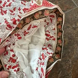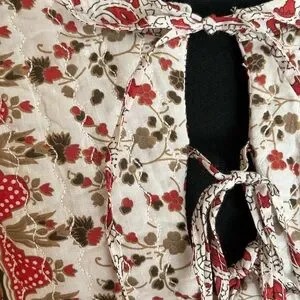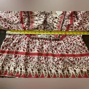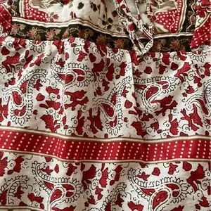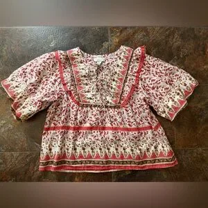 New with tags women’s 100% cotton pull over Calypso St Barth milkmaid peasant boho flowy top. Chili pepper red, brown and cream pattern top. Quilted front chest and back, with ruffle detail, puffy elastic band sleeves and 3 tie closure. Size large. See photos for measurements. Boho, festival, countrycore, cottagecore, hippie