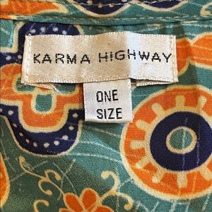 Karma Highway lightweight 100% viscose blouse in vibrant teal, navy, and burnt orange retro print. Flowy V-neck silhouette with kimono-style sleeves and adjustable front tie detail. Easy, airy drape — perfect for festival, travel, or summer layering.