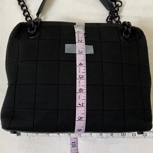 Excellent pre-loved condition for vintage Chanel bag! Chanel square quilt (some call it chocolate bar) black jersey fabric shoulder bag with chain and leather straps. This is the larger size of this style. Exterior zip closure. Interior is one large compartment with one zippered pocket. The zippers function properly. Seven digit serial number beginning with 6, production year 2000-2002. The bag is semi-structured as the underside of the fabric is lined with interfacing to give to bag structure. Exterior fabric is in great condition with no holes, pulls or stains detected. The upper corners of the bag have a tendency to dimple inward. It’s not really a flaw or very noticeable when carrying since the bag is black, but I felt it should be disclosed. The chains have some light color loss between the links from friction. The bottom base leather has some subtle discoloration/water staining visible at certain lighting angles, but no significant scratches or scuffs (see photos). PLEASE NOTE: One of the feet on the base lost its Chanel rubber cover/cap and it was replaced with a generic black cap (see photos) to restore function and uniform appearance. Measurements and hallmarks in photos. Poshmark will confirm authenticity for free.