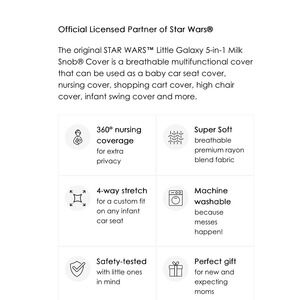 The original STAR WARS™ Little Galaxy 5-in-1 Milk Snob® Cover is a breathable multifunctional cover that can be used as a baby car seat cover, nursing cover, shopping cart cover, high chair cover, infant swing cover and more.