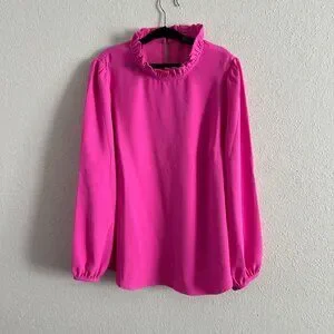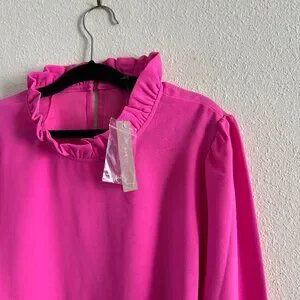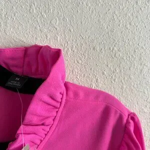 NWT Pink Ruffle Neck Medium (M) Blouse. Button closure for the neck at the back. It's gently used and from a smoke-free and pet-free home.