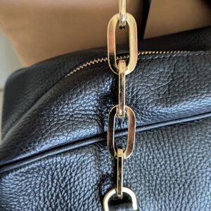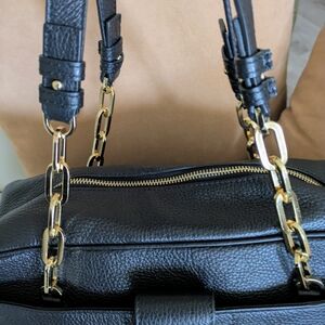 Elegant black leather shoulder bag featuring gold chain accents and a stylish lock closure. Perfect for adding a touch of sophistication to any outfit.