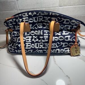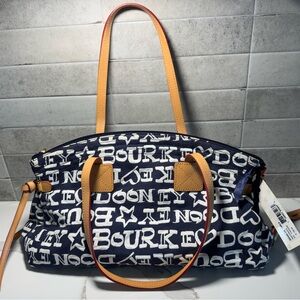 Dooney & Burke Duffel Bag. Blue and white signature monogram, and tan leather straps. Side ties allow bag to expand.