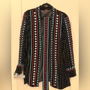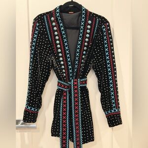This piece is the 'Corinne' or 'Siya' kimono-style jacket featuring intricate embroidery and decorative golden-bronze buttons and turquoise and burgundy stitching. Optional matching belt included.