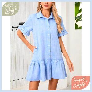 Cotton Linen Mini Dress Drop Waist Button Down Ruffle Sleeves Casual