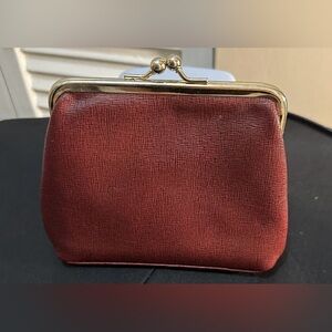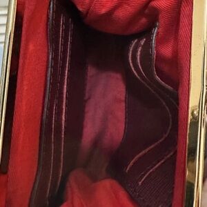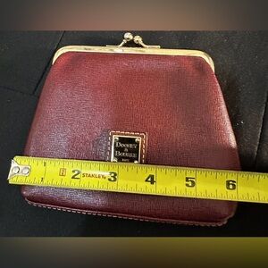 Vintage Chic red clutch by Dooney & Bourke, featuring elegant gold accents. Perfect for any occasion. Burgandy