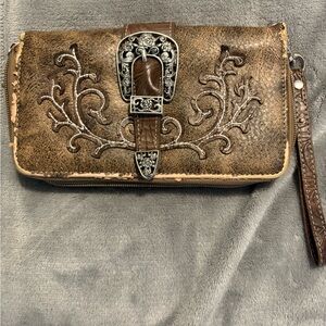 Inside very clean never used outside —Has wear and tear great for the perfect person who loves touching up bags or loves the look !!!This vintage brown leather clutch features an ornate buckle, adding a touch of elegance to your ensemble. Perfect for any occasion.