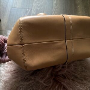 This stylish tan leather handbag is perfect for any occasion. Its elegant design and high-quality material make it a must-have accessory. Excellent condition. Pet free home.