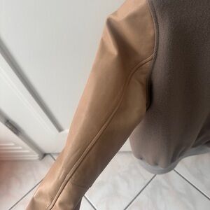Stylish bomber jacket in brown and tan, perfect for any occasion. Features a comfortable fit and sleek design.