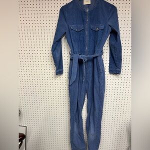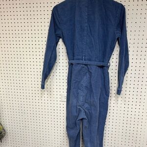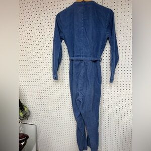 Chic blue jumpsuit featuring a front zipper. Includes long sleeves and a stylish waist tie. Ideal for casual outings.