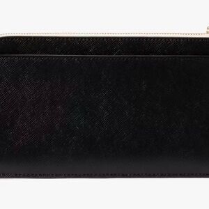 Design: The wristlet has an L-zip closure, an attached wrist strap, and an exterior back slip pocket.