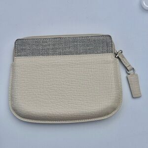 The pouch features a two-tone design with a textured beige leather body and a contrasting grey fabric trim along the top. It includes a top zipper with a leather pull and a small, square leather loop on the front. The Loewe name is subtly embossed on the front.
