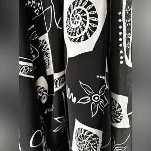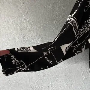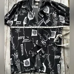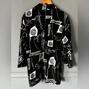 Bold vintage Peter Popovitch open front jacket featuring a striking black and white abstract print. Lightweight with an easy draped silhouette and 3/4 sleeves. A true statement layering piece with artistic flair.