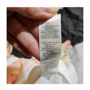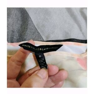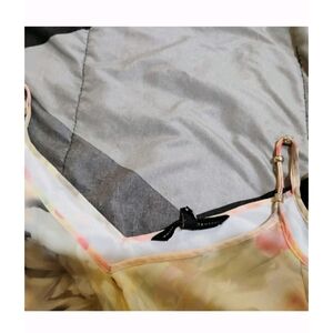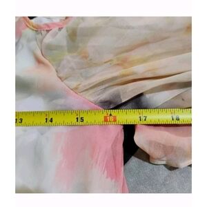 Elegant high low dress with pastel floral pattern. Features soft pink, gray, and cream hues. Perfect for special occasions.