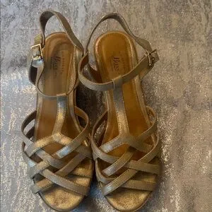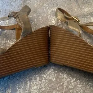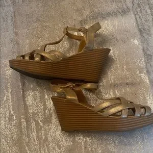 Elegant gold sandals with strappy design. Perfect for any occasion.