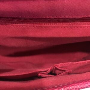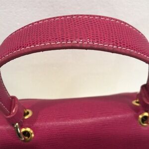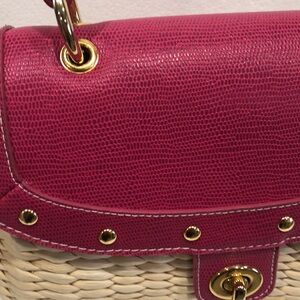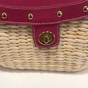 Stylish pink and tan woven bag perfect for any occasion. Features a chic design with gold accents. Ideal for adding a pop of color to your outfit.