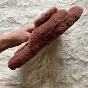 Keywords: Cozycure, Loungewear, Sleepwear, Faux Fur, Plush, Mauve, Dusty Rose, Minimalist, Comfort, House Shoes, Slides, Criss Cross, Soft, Feminine, Relaxed