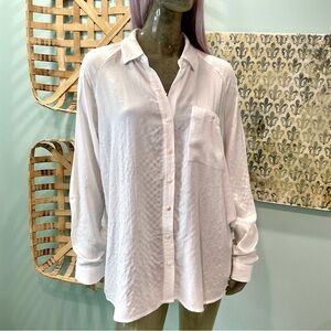 Stylish white button down shirt. Features long sleeves and front pocket. Perfect for casual wear.
