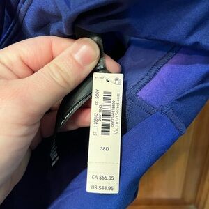 NWT Victoria’s Secret high neck sports bra with criss-cross backing. Size 38D. Vibrant blue and purple color.
