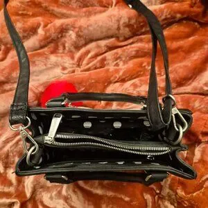 Chic Loungefly crossbody with Mickey design. Features black and white color scheme. Includes red pom-pom and glove charm.