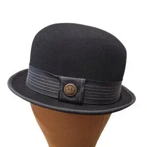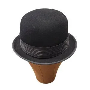 Timeless black wool bowler hat crafted with precision, featuring a textured ribbon band and subtle crown detailing for sophisticated headwear.