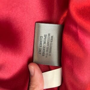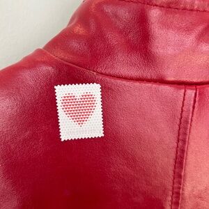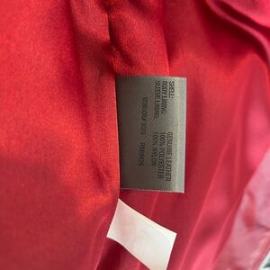 Bold and stylish red leather jacket. Features a sleek design with zippered pockets. Ideal for a chic look.