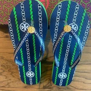 Very Chic & fun color flip flops with navy and green chain design. Features iconic Tory Burch ivory & gold emblem on straps.