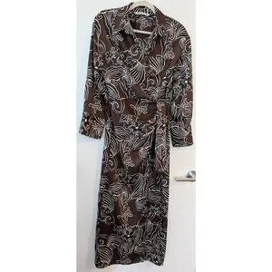 Zara Satin Brown Black Floral Wrap Midi Shirt Dress 9445/853