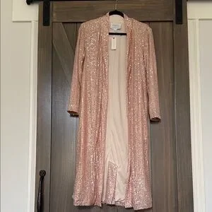 Shimmering sequin longline cardigan in rose gold. Perfect for adding sparkle to any outfit. So cute with jeans w tennis shoes or dress it up! No closure, but has pockets!