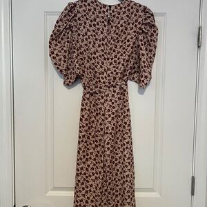 Elegant floral midi dress with puff sleeves. Perfect for any occasion.