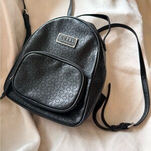 Chic GUESS backpack with embossed logo pattern. Sleek black design. Perfect for everyday use.