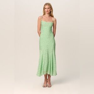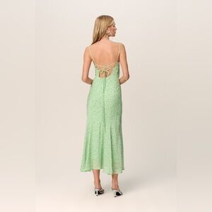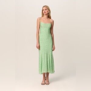 Verona Midi Dress in pastel green. The dress has adjustable shoulder straps, and an open back and is made of a slinky material. It is lined and has a flowy skirt.