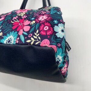 • Exterior: floral print, center zip compartment, front and back slip pockets, front zip pocket