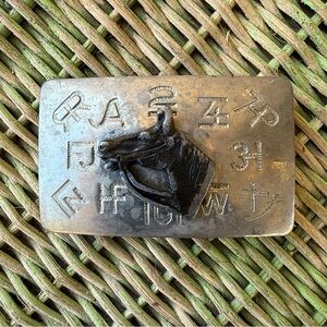 Vintage Chambers Belt Company belt buckle featuring a horse head centered over Western ranch branding symbols. Made in the USA.