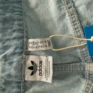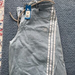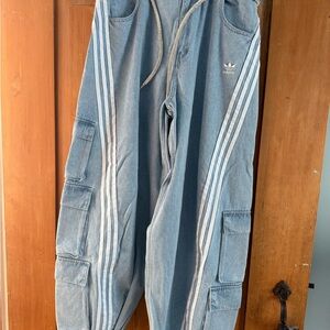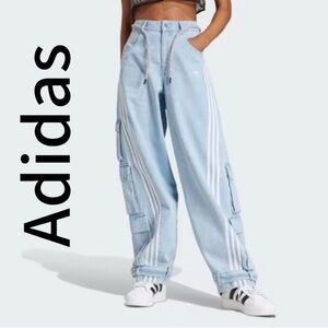 Stylish Adidas track pants in sky blue. Features cargo pockets and signature stripes. Ideal for casual wear.