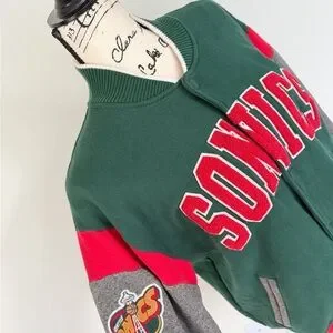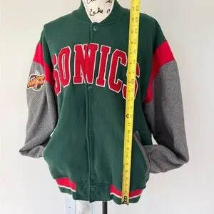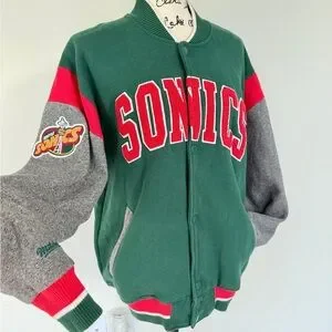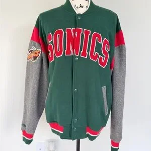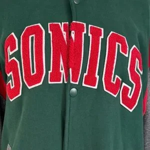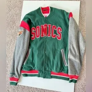 2014 Mitchell & Mess Seattle Super Sonic Classic varsity jacket by Mitchell & Ness. Features Sonics logo patch. Bold green, gray, and red design.