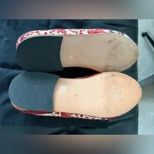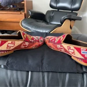Men’s size 9 Sumak Kilim Loafers. Kilims are crafted from a mixture of silk and wool for stronger weave. Each pair is unique. These shoes have never been worn outside.