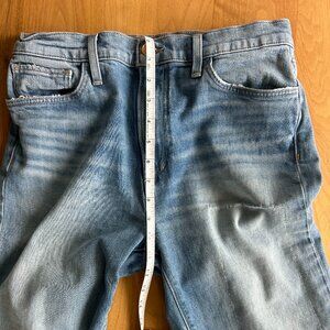 Light wash with vintage-inspired wear patterns and raw hem.