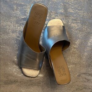 Chic metallic mules by Naturalizer. Sleek design with open toe. Ideal for stylish comfort.