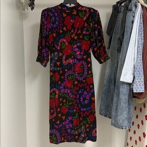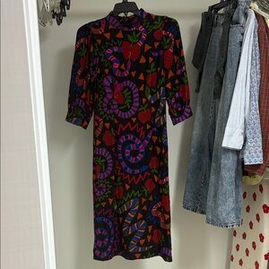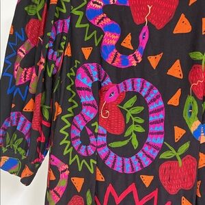 Bold, vibrant, and unmistakably FARM Rio. This Jungle Snake Fruit midi dress features a rich black background layered with colorful fruit, snake, and abstract motifs. The relaxed silhouette and puff sleeves make it comfortable yet elevated — perfect for everyday wear or styled up for an artsy statement look.