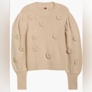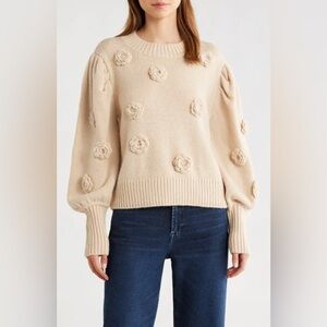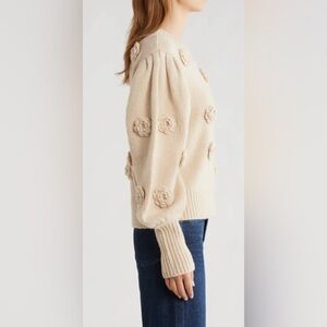 Tonal crochet blooms. Crew neck. Long Juliet sleeve with dropped shoulders. Ribbed cuff and hem. 45% acrylic, 35% nylon, 15% wool, 10% alpaca. Original Price $298.