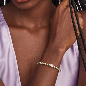"A wrist stack essential, meet the Mini Elaina Gold Stretch Bracelet. Pairing our dainty mini Elaina framed in classic hoofprint detailing with beads that offer a near-blinding shine, this piece is both chic and playful. Let it speak for itself or stack it with your favorite bracelets, you can’t wear this one wrong.