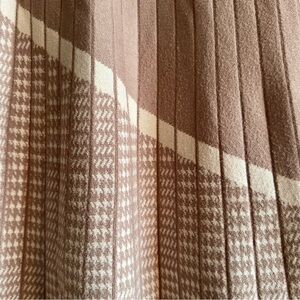 Elegant wool blend pleated midi skirt in a warm brown tone with subtle plaid detailing and an asymmetric color-block design. Soft knit feel with fluid movement and a flattering A-line drape.