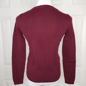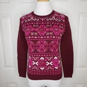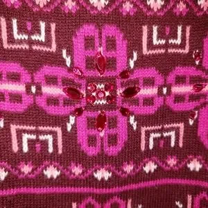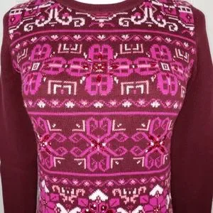 Features: Pullover, crew neck, front is knit Nordic pattern, burgundy/maroon with shades of pink and sparkly bling, back & sleeves are solid burgundy, 70% nylon 30% lambswool