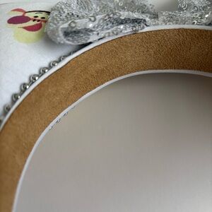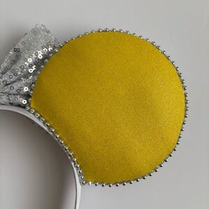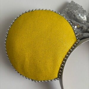 The fabric on the front with Pooh, Piglet, Tigger and Eeyore is soft, like a t-shirt material. The back is a stiffer sparkly yellow material. The ears are outlined in a silver bead trim. The bow is covered in silver sequins. The headband is thin and flexible; it is wrapped in white fabric with a brown suede-like fabric on the inside.