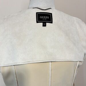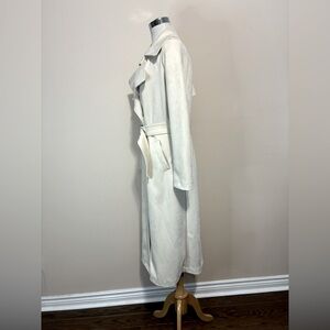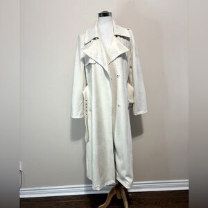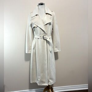 Guess Women’s Belted Microfibre Trench Coat. Size is medium and the pit to pit is medium and the length is 47”. Double breasted snap button style with wide lapels, two lower pockets and adjustable belt. Chic cream trench coat with a polished look. The interior is unlined with one pocket. Made in China and the material is 90% polyester and 10% elastane. The overall condition is good for a preloved coat.