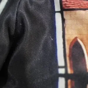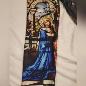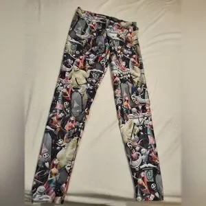 Blackmail brand legging lot of two pairs. Both are size large. Both are used, in good shape. Please note that the "Saint/Mary" pair is thinner and has a small pull on the front, by the crotch (pictured). The Nightmare Before Christmas pair is in great shape. Both were stored in a bin and should be laundered. Non-smoking home but we have one white cat. See photos.